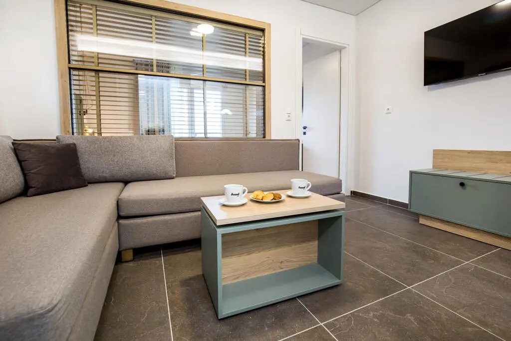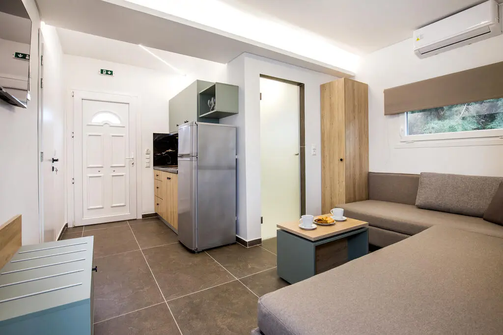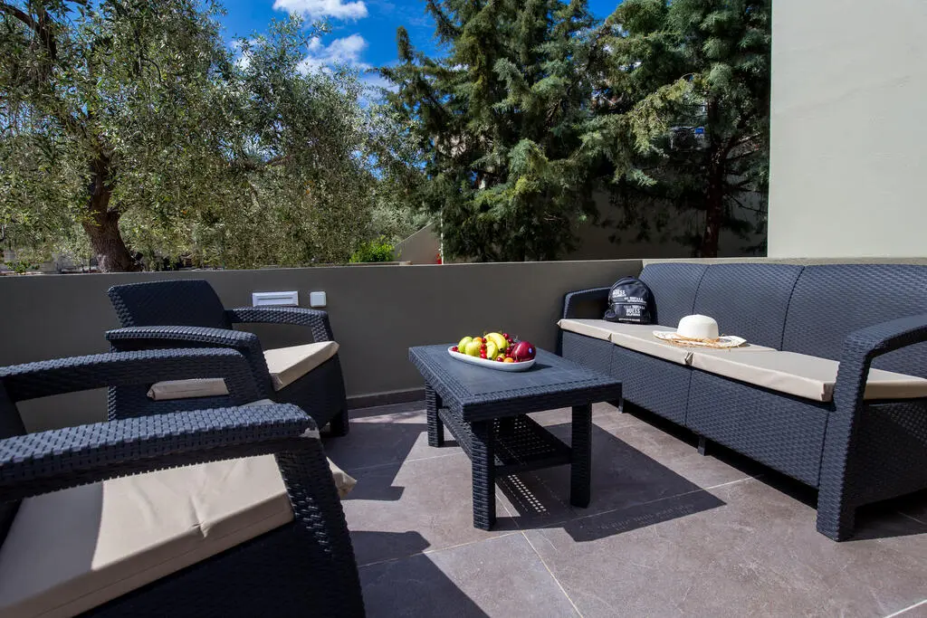 The apartment of 36 square meters consists of a separate bedroom with a double bed and an open plan area of a fully equipped kitchen with fridge and a corner sofa bed. It also has air conditioning, satellite TV, hairdryer, safe and all the necessary amenities that will make you feel at home. It offers a fully equipped balcony with sea view as well as an equipped private space in the courtyard garden. Suitable for families with 2 adults and 2 children maximum.